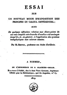 In late 1814, he consolidated his ideas on an algebraic formalization of calculus in his most celebrated work, Essai sur un nouveau mode d'exposition des principes du calcul différential (Essay on a New Method of Exposition of the Principles of Differential Calculus).[6] It was in this paper, when considering abstract functional equations of differential calculus, that he proposed the terms "commutative" and "distributive" to describe properties of functions.
