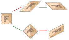 Composition of a shear mapping (red) and a clockwise rotation by 45° (green). On the left is the original object. Above is shear, then rotate. Below is rotate, then shear.