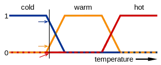 For example, in the image below, the meanings of the expressions cold, warm, and hot are represented by functions mapping a temperature scale. A point on that scale has three "truth values"—one for each of the three functions. The vertical line in the image represents a particular temperature that the three arrows (truth values) gauge. Since the red arrow points to zero, this temperature may be interpreted as "not hot"; i.e. this temperature has zero membership in the fuzzy set "hot". The orange arrow (pointing at 0.2) may describe it as "slightly warm" and the blue arrow (pointing at 0.8) "fairly cold". Therefore, this temperature has 0.2 membership in the fuzzy set "warm" and 0.8 membership in the fuzzy set "cold". The degree of membership assigned for each fuzzy set is the result of fuzzification.