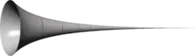 These colourful informal names and the allusion to religion came along later.[1] Torricelli's own name for it is to be found in the Latin title of his paper De solido hyperbolico acuto, written in 1643, a truncated acute hyperbolic solid, cut by a plane.[2] Volume 1, part 1 of his Opera geometrica published the following year included that paper and a second more orthodox (for the time) Archimedean proof of its theorem about the volume of a truncated acute hyperbolic solid.[2][3] This name was used in mathematical dictionaries of the 18th century, including "Hyperbolicum Acutum" in Harris' 1704 dictionary and in Stone's 1726 one, and the French translation Solide Hyperbolique Aigu in d'Alembert's 1751 one.[1]