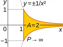 with the domain and rotating it in three dimensions about the x axis. The discovery was made using Cavalieri's principle before the invention of calculus, but today, calculus can be used to calculate the volume and surface area of the horn between x = 1 and x = a, where a > 1.[6] Using integration (see Solid of revolution and Surface of revolution for details), it is possible to find the volume V and the surface area A: