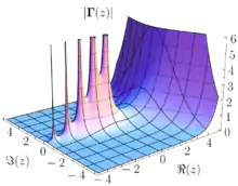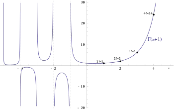 The behavior for non-positive is more intricate. Euler's integral does not converge for , but the function it defines in the positive complex half-plane has a unique analytic continuation to the negative half-plane. One way to find that analytic continuation is to use Euler's integral for positive arguments and extend the domain to negative numbers by repeated application of the recurrence formula,[1]