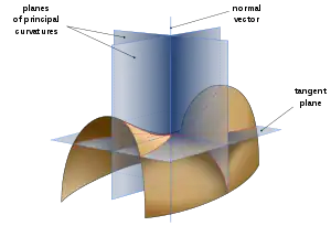 At any point on a surface, we can find a normal vector that is at right angles to the surface; planes containing the normal vector are called normal planes. The intersection of a normal plane and the surface will form a curve called a normal section and the curvature of this curve is the normal curvature. For most points on most “smooth” surfaces, different normal sections will have different curvatures; the maximum and minimum values of these are called the principal curvatures, call these κ1, κ2. The Gaussian curvature is the product of the two principal curvatures Κ = κ1κ2.