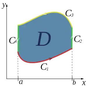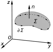 Let be a piecewise smooth Jordan plane curve. The Jordan curve theorem implies that divides into two components, a compact one and another that is non-compact. Let denote the compact part that is bounded by and suppose is smooth, with . If is the space curve defined by [note 2] and is a smooth vector field on , then:[13][14][15]