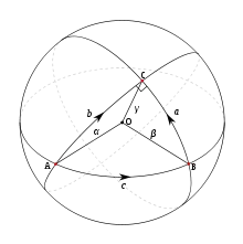 A geodesic triangle is formed by the geodesics joining each pair out of three points on a given surface. On the sphere, the geodesics are great circle arcs, forming a spherical triangle.