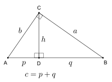 If h denotes the altitude in a right triangle and p and q the segments on the hypotenuse then the theorem can be stated as:[1]