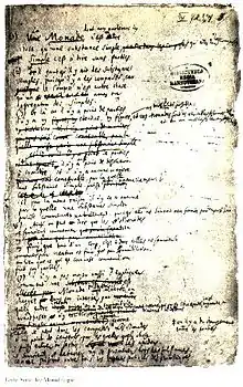 Leibniz dated his beginning as a philosopher to his Discourse on Metaphysics, which he composed in 1686 as a commentary on a running dispute between Nicolas Malebranche and Antoine Arnauld. This led to an extensive correspondence with Arnauld;[62] it and the Discourse were not published until the 19th century. In 1695, Leibniz made his public entrée into European philosophy with a journal article titled "New System of the Nature and Communication of Substances".[63] Between 1695 and 1705, he composed his New Essays on Human Understanding, a lengthy commentary on John Locke's 1690 An Essay Concerning Human Understanding, but upon learning of Locke's 1704 death, lost the desire to publish it, so that the New Essays were not published until 1765. The Monadologie, composed in 1714 and published posthumously, consists of 90 aphorisms.