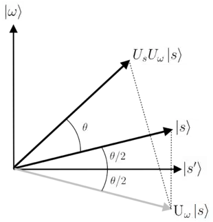 Grover's algorithm begins with the initial ket , which lies in the subspace. The operator is a reflection at the hyperplane orthogonal to for vectors in the plane spanned by and , i.e. it acts as a reflection across . This can be seen by writing in the form of a Householder reflection: