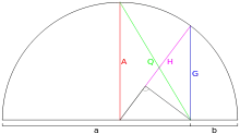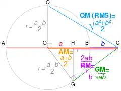- If AC = a and BC = b. OC = AM of a and b, and radius r = QO = OG.
