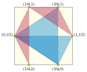 More formally, the shape may be assumed to be a compact set in the plane, meaning that it stays within a bounded distance from the origin and that points are allowed to be placed on its boundary. In most work on this problem, is additionally a convex set of nonzero area. When three of the placed points lie on a line, they are considered as forming a degenerate triangle whose area is defined to be zero, so placements that maximize the smallest triangle will not have collinear triples of points. The assumption that the shape is compact implies that there exists an optimal placement of points, rather than only a sequence of placements approaching optimality. The number may be defined as the area of the smallest triangle in this optimal placement.[1][lower-alpha 1] An example is shown in the figure, with six points in a unit square. These six points form different triangles, four of which are shaded in the figure. Six of these 20 triangles, with two of the shaded shapes, have area 1/8; the remaining 14 triangles have larger areas. This is the optimal placement of six points in a unit square: all other placements form at least one triangle with area 1/8 or smaller. Therefore, .[2]