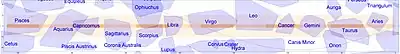 Ptolemy's constellation areas (blue polygons) and "signs" of the zodiac had different sizes and extends; it is highly likely Hipparchus considered these units the same. Reconstruction from the Almagest[39]