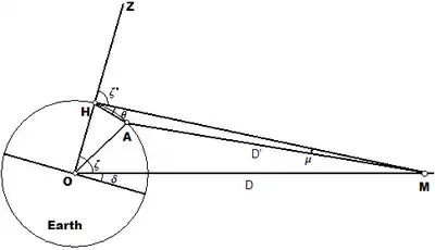 Like others before and after him, he also noticed that the Moon has a noticeable parallax, i.e., that it appears displaced from its calculated position (compared to the Sun or stars), and the difference is greater when closer to the horizon. He knew that this is because in the then-current models the Moon circles the center of the Earth, but the observer is at the surface—the Moon, Earth and observer form a triangle with a sharp angle that changes all the time. From the size of this parallax, the distance of the Moon as measured in Earth radii can be determined. For the Sun however, there was no observable parallax (we now know that it is about 8.8", several times smaller than the resolution of the unaided eye).