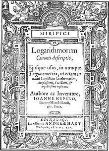 The method of logarithms was first publicly propounded by John Napier in 1614, in a book titled Mirifici Logarithmorum Canonis Descriptio.[26] [27] [28]
