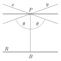 These limiting parallels make an angle θ with PB; this angle depends only on the Gaussian curvature of the plane and the distance PB and is called the angle of parallelism.
