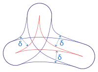 Let be a finitely generated group, and be its Cayley graph with respect to some finite set of generators. The set is endowed with its graph metric (in which edges are of length one and the distance between two vertices is the minimal number of edges in a path connecting them) which turns it into a length space. The group is then said to be hyperbolic if is a hyperbolic space in the sense of Gromov. Shortly, this means that there exists a such that any geodesic triangle in is -thin, as illustrated in the figure on the right (the space is then said to be -hyperbolic).