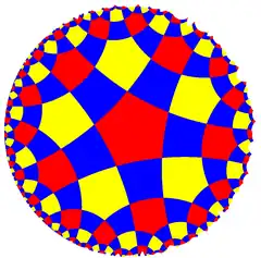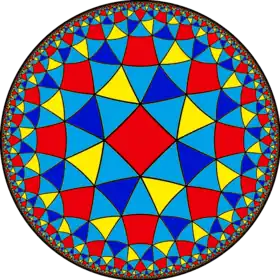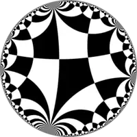 There are an infinite number of uniform tilings based on the Schwarz triangles (p q r) where 1/p + 1/q + 1/r < 1, where p, q, r are each orders of reflection symmetry at three points of the fundamental domain triangle – the symmetry group is a hyperbolic triangle group.