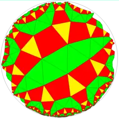 triangular prism (The "edge" between each pair of tetragons counts as a degenerate digon face. The other edges (the ones between a trigon and a tetragon) are normal edges.) | rhombitetratetrahedron![]() | rhombicuboctahedron![]() | rhombicosidodecahedron ![]() | rhombitrihexagonal tiling![]() | Rhombitriheptagonal tiling ![]() | Rhombitrioctagonal tiling ![]() | ||||||