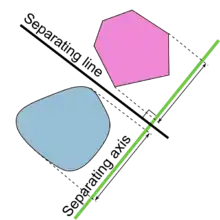 Separating axis theorem — Two closed convex objects are disjoint if there exists a line ("separating axis") onto which the two objects' projections are disjoint.
