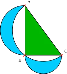 In elementary geometry, Alhazen attempted to solve the problem of squaring the circle using the area of lunes (crescent shapes), but later gave up on the impossible task.[130] The two lunes formed from a right triangle by erecting a semicircle on each of the triangle's sides, inward for the hypotenuse and outward for the other two sides, are known as the lunes of Alhazen; they have the same total area as the triangle itself.[131]