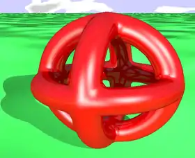 POV-Ray image: metamorphoses between a sphere and a constant distance product surface (6 points).