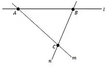 An incidence structure (P, L, I) consists of a set P whose elements are called points, a disjoint set L whose elements are called lines and an incidence relation I between them, that is, a subset of P × L whose elements are called flags.[2] If (A, l) is a flag, we say that A is incident with l or that l is incident with A (the terminology is symmetric), and write A I l. Intuitively, a point and line are in this relation if and only if the point is on the line. Given a point B and a line m which do not form a flag, that is, the point is not on the line, the pair (B, m) is called an anti-flag.