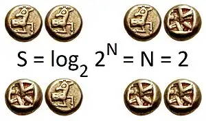 Here, the entropy is at most 1 bit, and to communicate the outcome of a coin flip (2 possible values) will require an average of at most 1 bit (exactly 1 bit for a fair coin). The result of a fair die (6 possible values) would have entropy log26 bits.