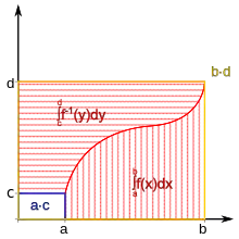 The figure on the right is a proof without words of this formula. Laisant does not discuss the hypotheses necessary to make this proof rigorous, but this can be proved if is just assumed to be strictly monotone (but not necessarily continuous, let alone differentiable). In this case, both and are Riemann integrable and the identity follows from a bijection between lower/upper Darboux sums of and upper/lower Darboux sums of .[2][3] The antiderivative version of the theorem then follows from the fundamental theorem of calculus in the case when is also assumed to be continuous.