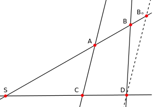 |SA| / |SB| = |SC| / |SD| does not necessarily imply AC is parallel to BD. - Kazarinoff, Nicholas D. (2003) [1970], Ruler and the Round, Dover, p. 3, ISBN 0-486-42515-0