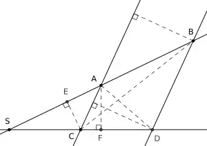 Suppose S is the common starting point of two rays, and two parallel lines are intersecting those two rays (see figure). Let A, B be the intersections of the first ray with the two parallels, such that B is further away from S than A, and similarly C, D are the intersections of the second ray with the two parallels such that D is further away from S than C. In this configuration the following statements hold:[1][2]