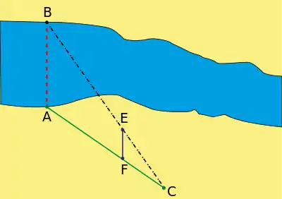 The intercept theorem can be used to determine a distance that cannot be measured directly, such as the width of a river or a lake, the height of tall buildings or similar. The graphic to the right illustrates measuring the width of a river. The segments ,, are measured and used to compute the wanted distance . |