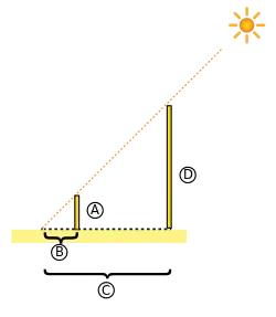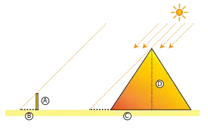 According to some historical sources the Greek mathematician Thales applied the intercept theorem to determine the height of the Cheops' pyramid. The following description illustrates the use of the intercept theorem to compute the height of the pyramid. It does not, however, recount Thales' original work, which was lost.[9][10]