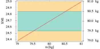 Consider the calculation of a person's body mass index (BMI). BMI is calculated as a person's body weight in kilograms divided by the square of their height in meters. Suppose a person uses a scale that has a precision of one kilogram, where intermediate values cannot be discerned, and the true weight is rounded to the nearest whole number. For example, 79.6 kg and 80.3 kg are indistinguishable, as the scale can only display values to the nearest kilogram. It is unlikely that when the scale reads 80 kg, the person has a weight of exactly 80.0 kg. Thus, the scale displaying 80 kg indicates a weight between 79.5 kg and 80.5 kg, or the interval .