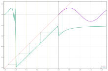 Fractional iteration of a function can be defined: for instance, a half iterate of a function f is a function g such that g(g(x)) = f(x).[12] This function g(x) can be written using the index notation as f 1/2(x) . Similarly, f 1/3(x) is the function defined such that f1/3(f1/3(f1/3(x))) = f(x), while f2/3(x) may be defined as equal to f 1/3(f1/3(x)), and so forth, all based on the principle, mentioned earlier, that f m ○ f n = f m + n. This idea can be generalized so that the iteration count n becomes a continuous parameter, a sort of continuous "time" of a continuous orbit.[13][14]