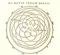 Diagram of the geocentric trajectory of Mars through several periods of apparent retrograde motion in Astronomia Nova (1609)