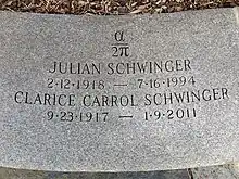 Schwinger died of pancreatic cancer. He is buried at Mount Auburn Cemetery; , where is the fine structure constant, is engraved above his name on his tombstone. These symbols refer to his calculation of the correction ("anomalous") to the magnetic moment of the electron.