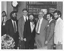 In 1969, Iverson and the APL group inaugurated the IBM Philadelphia Scientific Center.[29][39] In 1970 he was named IBM Fellow.[49] He used the funding that came with being an IBM Fellow to bring in visiting teachers and professors from various fields, including Donald McIntyre from Pomona[28] and Jeff Shallit as a summer student.[24] For a period of several months the visitors would start using APL for expositions in their own fields, and the hope was that later they would continue their use of APL at their home institutions.[50] Iverson's work at this time centered in several disciplines, including collaborative projects in circuit theory, genetics, geology, and calculus.[51][52][53][54] When the PSC closed in 1974,[29][34] some of the group transferred to California while others including Iverson remained in the East, later transferring back to IBM Research. He received the Turing Award in 1979.[1]