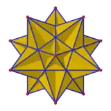 - "Another way to construct a great stellated dodecahedron via cumulation is to make 20 triangular pyramids [...] and attach them to the sides of an icosahedron." Weisstein, Eric W. "Great Stellated Dodecahedron". MathWorld. Retrieved 2018-09-21.