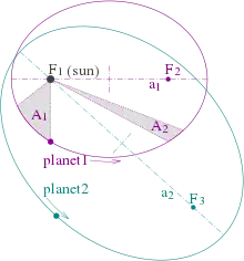 - The shaded areas A1 and A2 are equal, and are swept out in equal times by Planet 1's orbit.