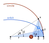 When the mean anomaly M is computed, the goal is to compute the true anomaly θ. The function θ = f(M) is, however, not elementary.[32] Kepler's solution is to use