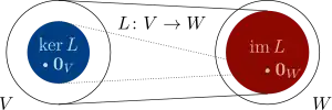 In mathematics, the kernel of a linear map, also known as the null space or nullspace, is the part (or linear subspace) of the domain which the map maps to the zero vector.[1] That is, given a linear map L : V → W between two vector spaces V and W, the kernel of L is the vector space of all elements v of V such that L(v) = 0, where 0 denotes the zero vector in W,[2] or more symbolically: