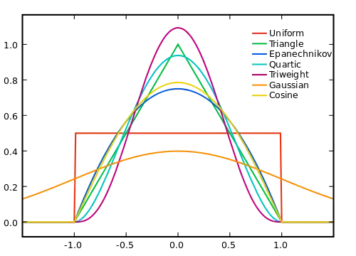 Several types of kernel functions are commonly used: uniform, triangle, Epanechnikov,[2] quartic (biweight), tricube,[3] triweight, Gaussian, quadratic[4] and cosine.