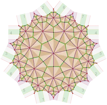 The dessin d'enfant on the Klein quartic associated with the quotient map by its automorphism group (with quotient the Riemann sphere) is precisely the 1-skeleton of the order-3 heptagonal tiling.[11] That is, the quotient map is ramified over the points 0, 1728, and ∞; dividing by 1728 yields a Belyi function (ramified at 0, 1, and ∞), where the 56 vertices (black points in dessin) lie over 0, the midpoints of the 84 edges (white points in dessin) lie over 1, and the centers of the 24 heptagons lie over infinity. The resulting dessin is a "platonic" dessin, meaning edge-transitive and "clean" (each white point has valence 2).