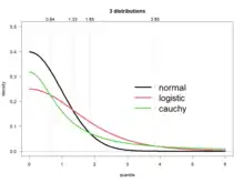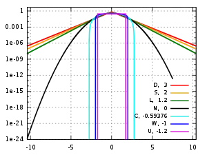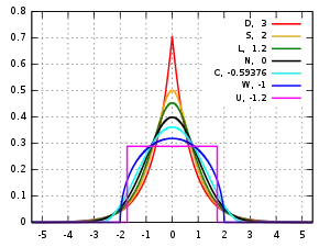Several well-known, unimodal, and symmetric distributions from different parametric families are compared here. Each has a mean and skewness of zero. The parameters have been chosen to result in a variance equal to 1 in each case. The images on the right show curves for the following seven densities, on a linear scale and logarithmic scale: