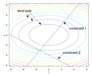 The method of Lagrange multipliers can be extended to solve problems with multiple constraints using a similar argument. Consider a paraboloid subject to two line constraints that intersect at a single point. As the only feasible solution, this point is obviously a constrained extremum. However, the level set of is clearly not parallel to either constraint at the intersection point (see Figure 3); instead, it is a linear combination of the two constraints' gradients. In the case of multiple constraints, that will be what we seek in general: The method of Lagrange seeks points not at which the gradient of is multiple of any single constraint's gradient necessarily, but in which it is a linear combination of all the constraints' gradients.
