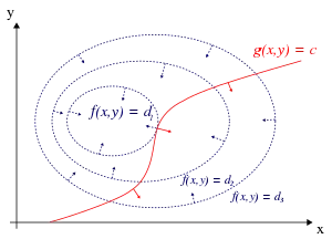 In mathematical optimization, the method of Lagrange multipliers is a strategy for finding the local maxima and minima of a function subject to equation constraints (i.e., subject to the condition that one or more equations have to be satisfied exactly by the chosen values of the variables).[1] It is named after the mathematician Joseph-Louis Lagrange.