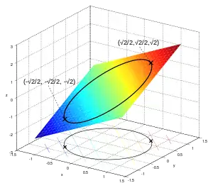 Suppose we wish to maximize subject to the constraint The feasible set is the unit circle, and the level sets of f are diagonal lines (with slope −1), so we can see graphically that the maximum occurs at and that the minimum occurs at