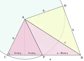 Case of acute angle γ, where a < 2b cos γ. Drop the perpendicular from A onto a = BC, creating a line segment of length b cos γ. Duplicate the right triangle to form the isosceles triangle ACP. Construct the circle with center A and radius b, and a chord through B perpendicular to c = AB, half of which is h = BH. Apply the Pythagorean theorem to obtain