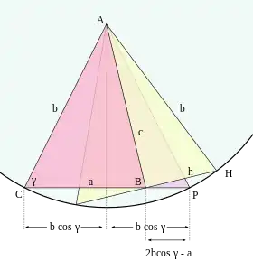 Case of acute angle γ, where a > 2b cos γ. Drop the perpendicular from A onto a = BC, creating a line segment of length b cos γ. Duplicate the right triangle to form the isosceles triangle ACP. Construct the circle with center A and radius b, and its tangent h = BH through B. The tangent h forms a right angle with the radius b (Euclid's Elements: Book 3, Proposition 18; or see here), so the yellow triangle in Figure 8 is right. Apply the Pythagorean theorem to obtain