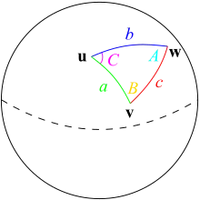 Versions similar to the law of cosines for the Euclidean plane also hold on a unit sphere and in a hyperbolic plane. In spherical geometry, a triangle is defined by three points u, v, and w on the unit sphere, and the arcs of great circles connecting those points. If these great circles make angles A, B, and C with opposite sides a, b, c then the spherical law of cosines asserts that both of the following relationships hold: