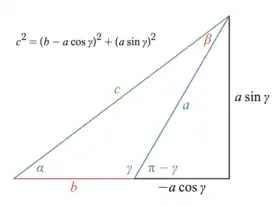 - if γ is obtuse, and so cos γ is negative, then −ab cos γ is the area of the parallelogram with sides a and b forming an angle of γ′ = γ − π/2.